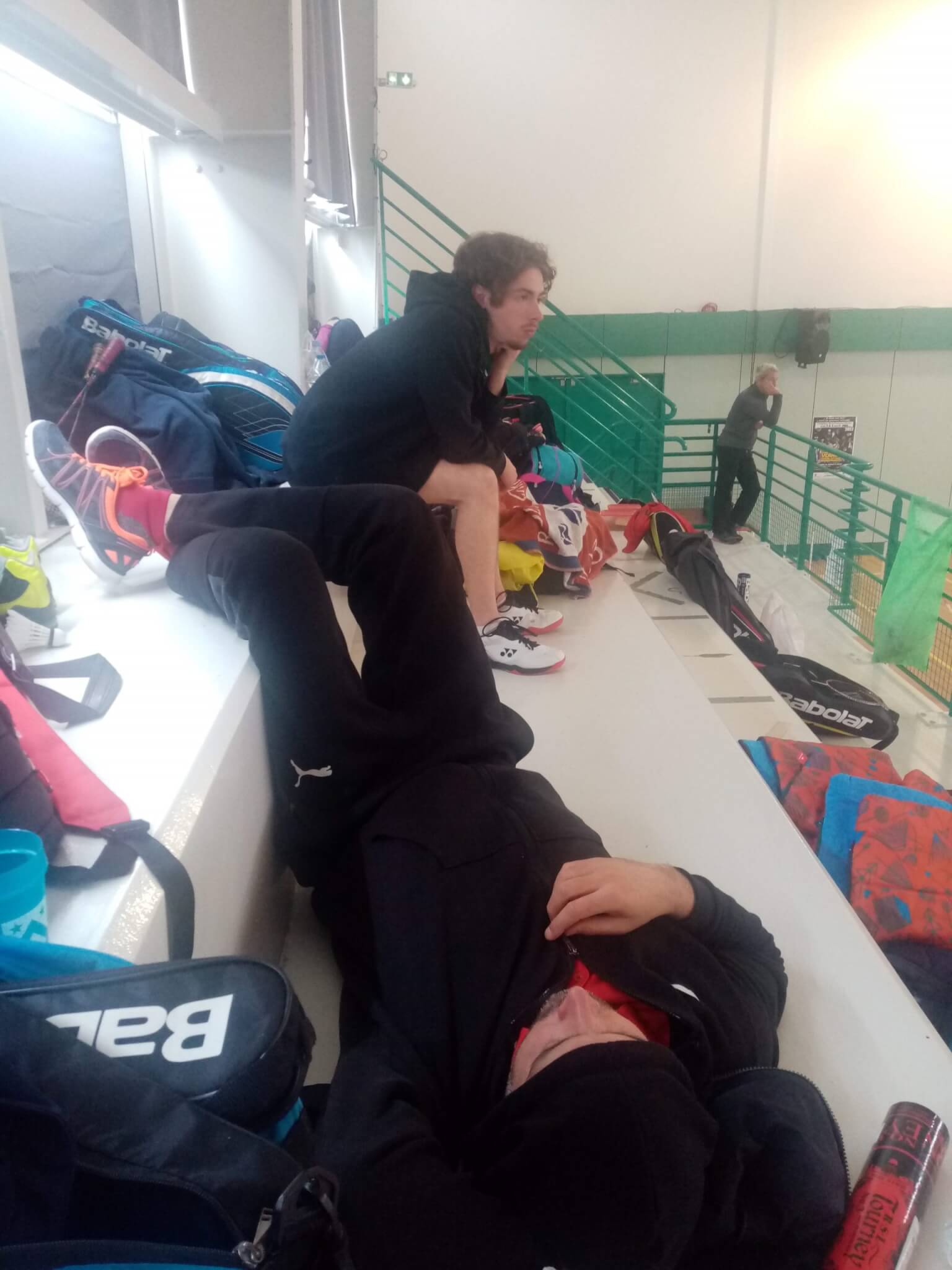 Bon, où en étions-nous ? Ah oui, les journées bonus en interclubs : après la courte défaite contre la Rochette 3 à 4, la brillante équipe 1 (vous avais-je déjà raconté à quel point sa saison fut parfaite ? Oui je sais Max, tu as réussi à la mettre en défaut une fois, silence) rencontra Vernou pour la deuxième journée bonus d’interclubs : la forme d’une partie de l’équipe était toute relative, tandis que Marie prenait le relais de Manu dans le rôle du grognon en chef en pestant contre un réveil matinal qu’elle s’était elle-même imposée (courir à 5h30, non mais ça va pas ? Y’a déjà les tournois pour se priver volontairement de repos!), y’a des jours comme ça où le capitaine doit maximiser ses émissions de bonnes ondes pour ramener ses brebis à la raison…et de bonnes ondes il y eut, puisque, sans coup férir, nos trois SH furent victorieux avec un Benoît très en forme en 1 malgré son inévitable (?) relâchement de fin de deuxième set, 21-13/21-19 et un Quentin impitoyable avec son adversaire au SH3 (21-03/21-06). De mon côté, j’avais pris le soin de refiler ma crève à Yann au SH2, crève qui avait légèrement handicapé le tournoi de Villeneuve le week-end précédent (voir plus bas) : victoire 21-17/21-13 malgré des fautes grossières. Aucun problème non plus pour Benoît et Quentin au DH (21-05/21-17), mais des difficultés pour « Angry Mary » au simple dames, qui s’incline face à Mathilde en deux sets, avant de rejoindre Julie pour un DD face à Mathilde et Marie (tiens, une ancienne Bellifontaine ? Elle reviendra sans doute à la raison quand elle verra que Fontainebleau deviendra –spoilers– le plus grand club du sud 77 à la rentrée, héhé, abonnement premium requis pour plus d’informations). DD plus accroché, mais perdu par nos deux combattantes 21-14/21-17. Heureusement, Julie brilla ensuite dans un mixte bien mené avec Manu face à Yann et Marie, se gardant de tout troisième set malencontreux, 22-20/21-17, joli ! Un 5 à 2 bien net.