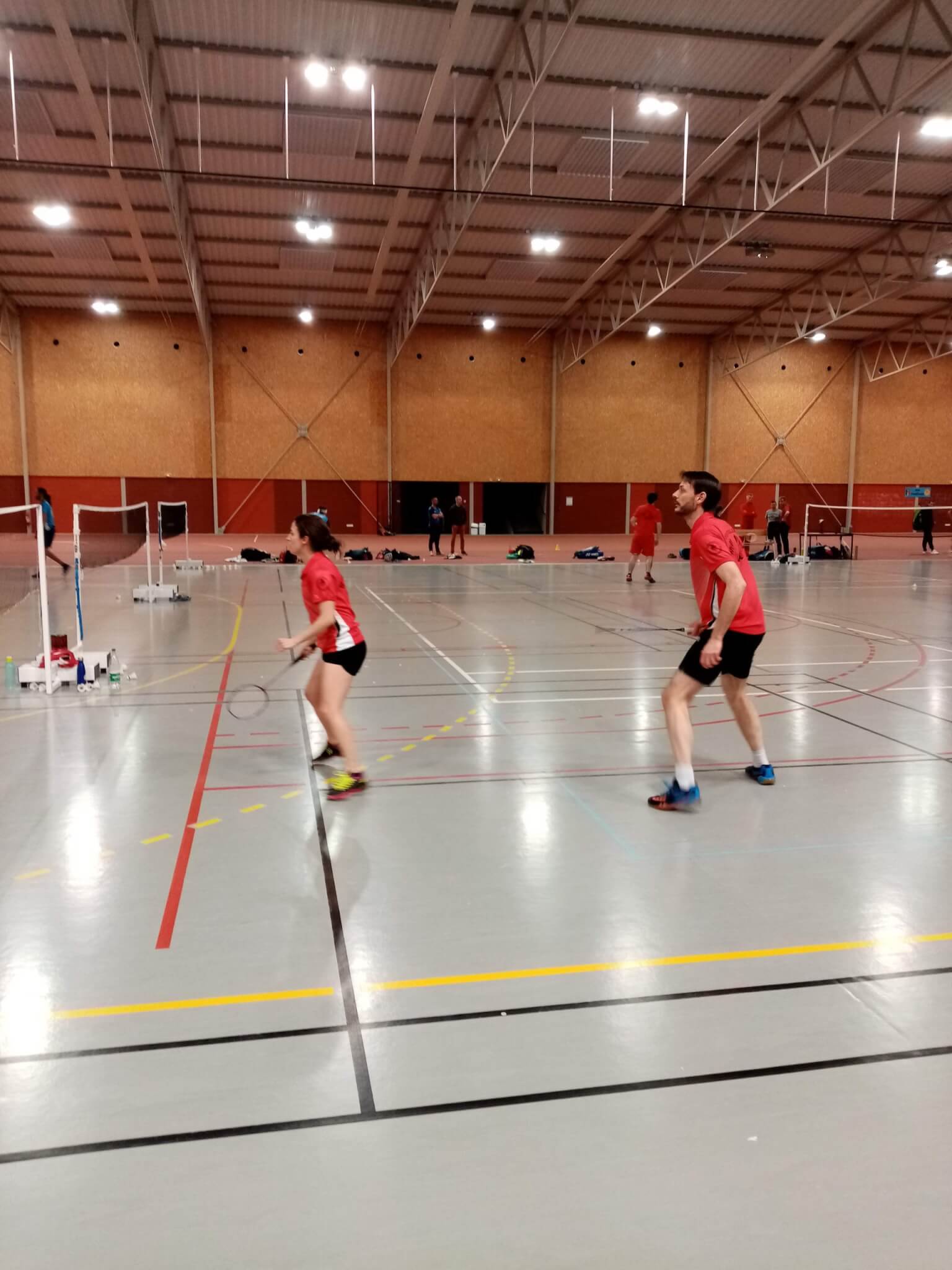 Place aux mixtes le dimanche : c’est l’embouteillage en D- avec pas moins de 6 poules et plusieurs paires de Fontainebleau, à savoir Pierre&Julie, Jean-Marie&Manon, Marie&Manu, et enfin Clémentine&moi, la grosse délégation quoi. Pas de sortie de poule hélas pour notre ancien président et Manon malgré un trois sets très disputé dans leur premier match ; du côté de Marie&Manu, ce sera du « pas de chance » : alors qu’ils ferraillaient sévère contre Laetitia et Laurent – futurs finalistes – la « vétéranitude » de Manu le saisit par le truchement d’une violente douleur au poignet, le conduisant à abandonner…bon repos à notre grognon favori !