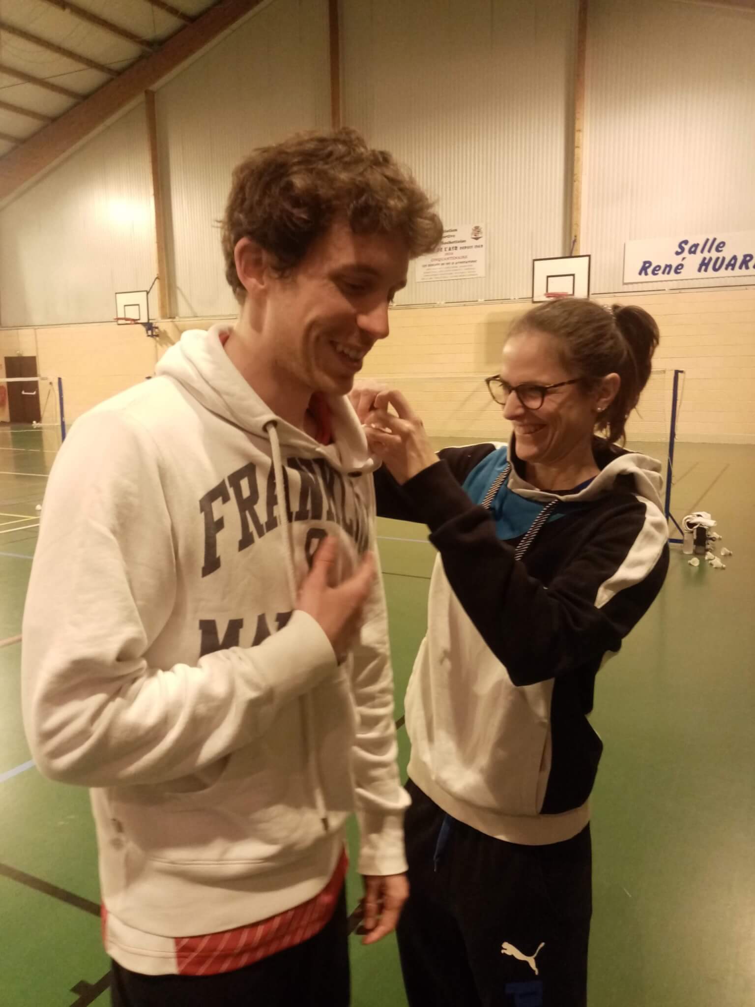 Enième victoire de Quentin au SH1 également, même s’il dut batailler pour s’imposer en deux sets face à Adrien (21-16/21-19). Un point de plus qui lui permit d’être décoré de l’Ordre des Badistes par sa coéquipière Claire, dans un moment incroyablement émouvant.
