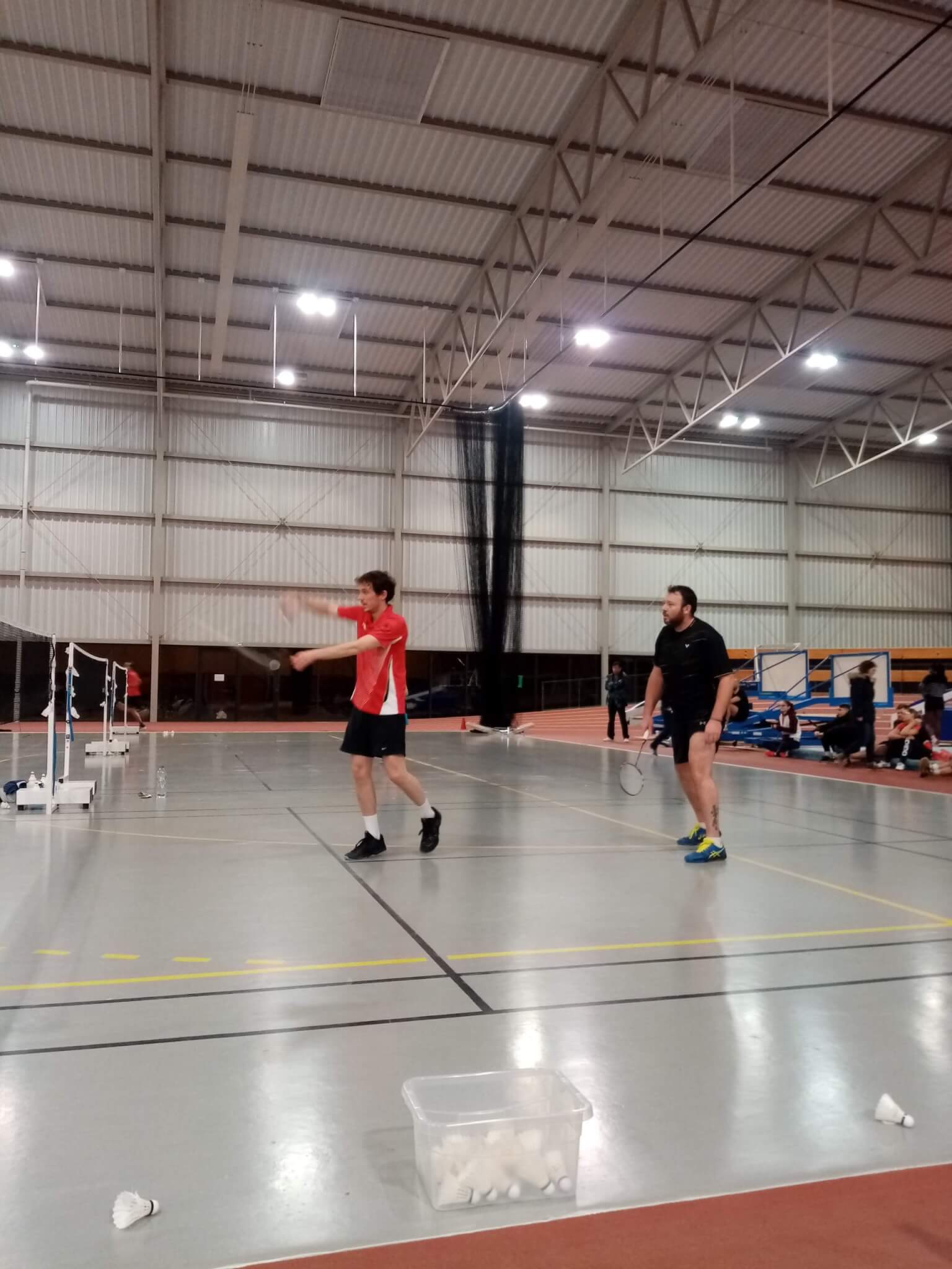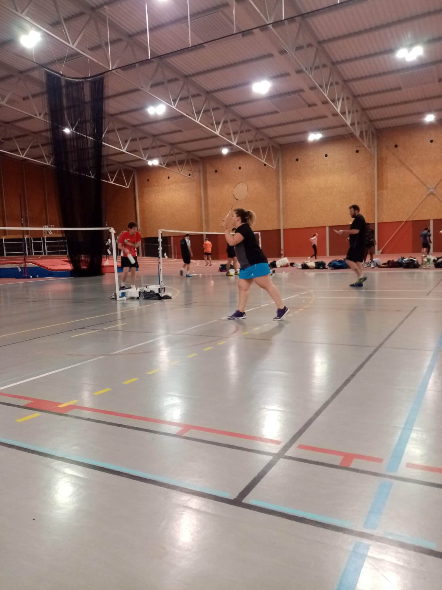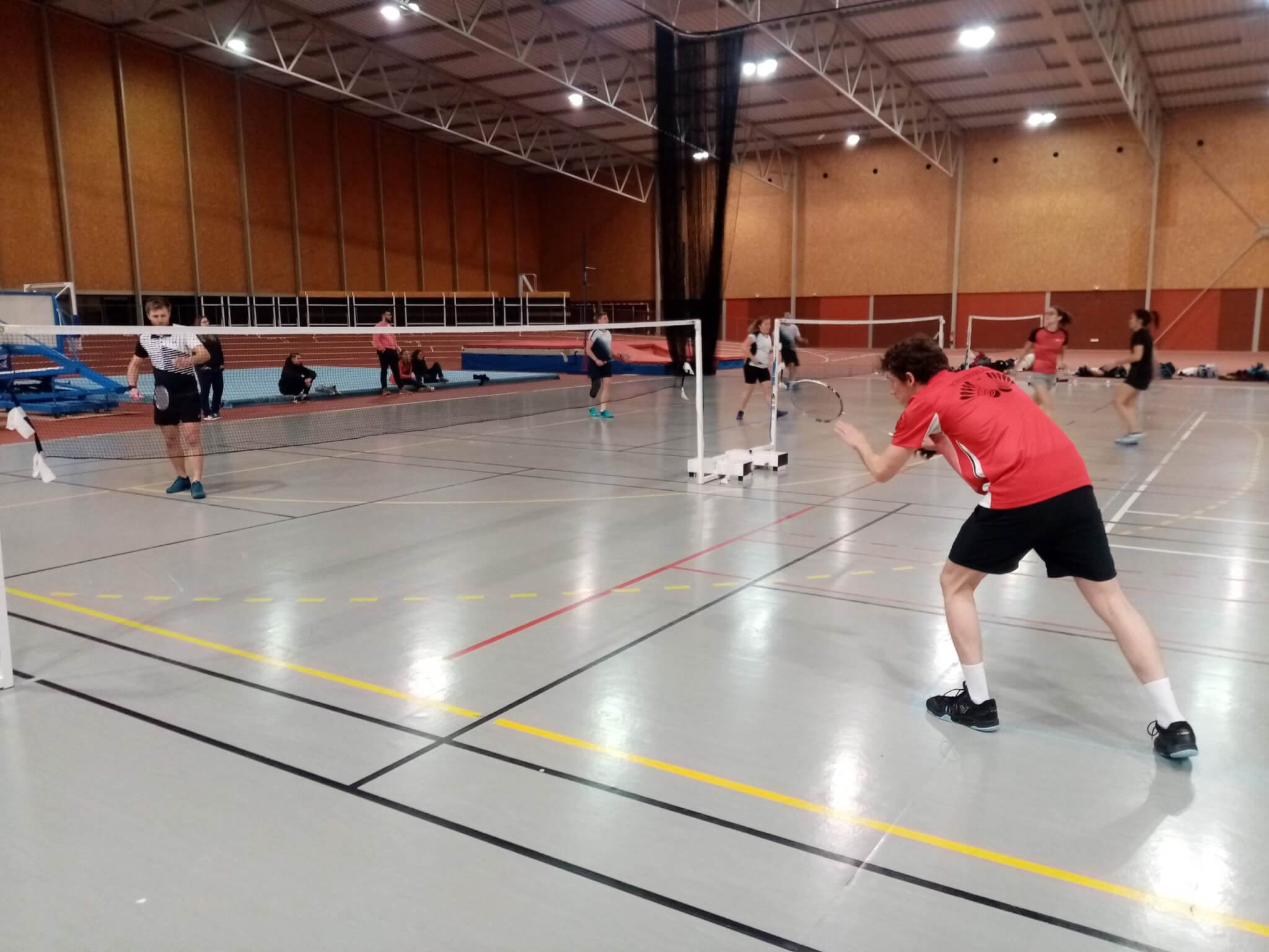 La halle étant peu occupée, on avait réquisitionné un quatrième terrain pour Benoît, aux prises avec Nathan au SH2 : suivant un scénario désormais bien rodé, il commence bien, puis s’énerve après avoir fait quelques fautes, perdant le premier set 16-21. Arrive ensuite Andréa, qui prend son ton le plus professoral pour lui dire de se calmer, ce qui fonctionne évidemment, et notre Bun’s va chercher le troisième en se battant comme un lion au deuxième (23-21), puis de remporter vaillamment le dernier 21-11, avec une belle collection d’amortis et de décalages sur le coup droit d’un Nathan désarçonné.